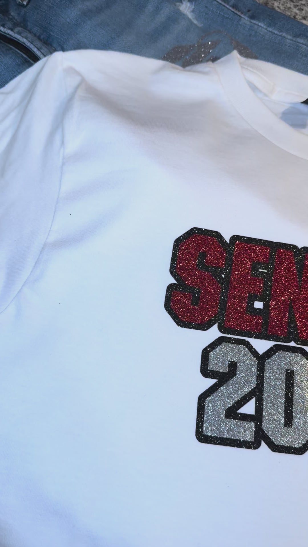 Celebrate your senior year in style with this Senior Shirt and Pant set featuring dazzling glitter appliques. Designed to stand out, the sparkling detail adds a touch of excitement and pride to your wardrobe. Perfect for commemorating milestones, this shirt and pant set combines comfort with eye-catching flair, making it an ideal keepsake for unforgettable memories.